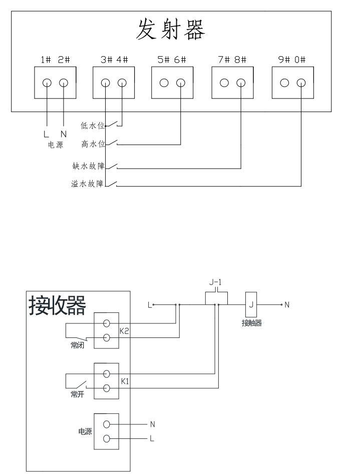 7.系统运行:设备运行时,请先将水塔内的水位设置为中间位置,然后将水塔内发射器的3#4#端子短接一下,接收器收到信号后启动水泵,进入工作状态。