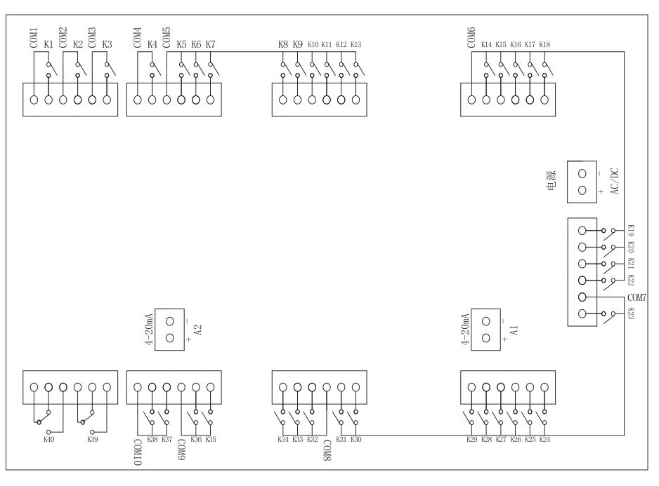 功能描述:40个继电器输出,2路模拟量输出(0-20mA,4-20mA等)